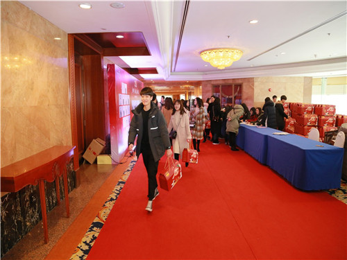 不一會,員工陸續(xù)抵達(dá)會場,有序地在外場禮品區(qū)簽字領(lǐng)取伴手禮盒,每個人臉上都洋溢著歡樂的笑容。